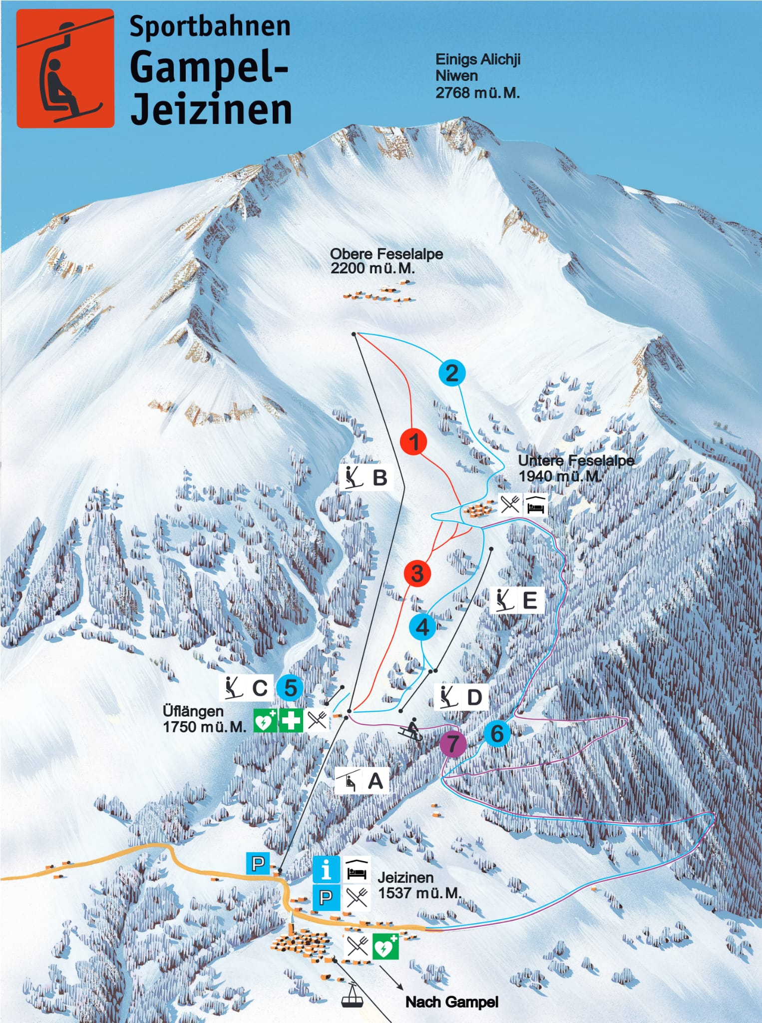 Geniessen sie den Tagesausflug ab der Talstation Gampel mit der Luftseilbahn Gampel-Jeizinen, die sie nach Jeizinen bringt. Wo Sie nach einem kurzen Fussmarsch durch das kleine, malerische und autofreie Dorf Jeizinen zu der Talstation der Sesselbahn gelangen. Sie können die Tageskarte in der Talstation in Gampel kaufen, oder dann bei der Talstation des Sessellift in Jeizinen. Sie erreichen die Talstation Sessellift auch über die Strasse Gampel Niedergampel Bratsch Erschmatt Engersch nach Jeizinen.